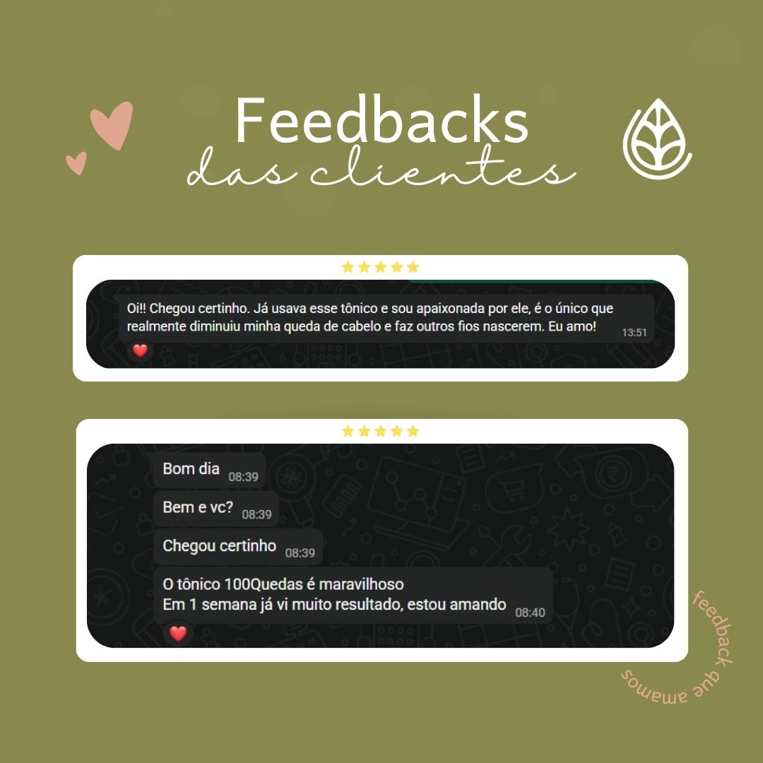 Diga adeus à queda de cabelo e dê as boas-vindas à vitalidade. Com ingredientes que equilibram o couro cabeludo e nutrem profundamente, o 100 Queda é mais do que um simples spray – é um tratamento completo, livre de toxinas e repleto de benefícios naturais que realmente fazem a diferença.